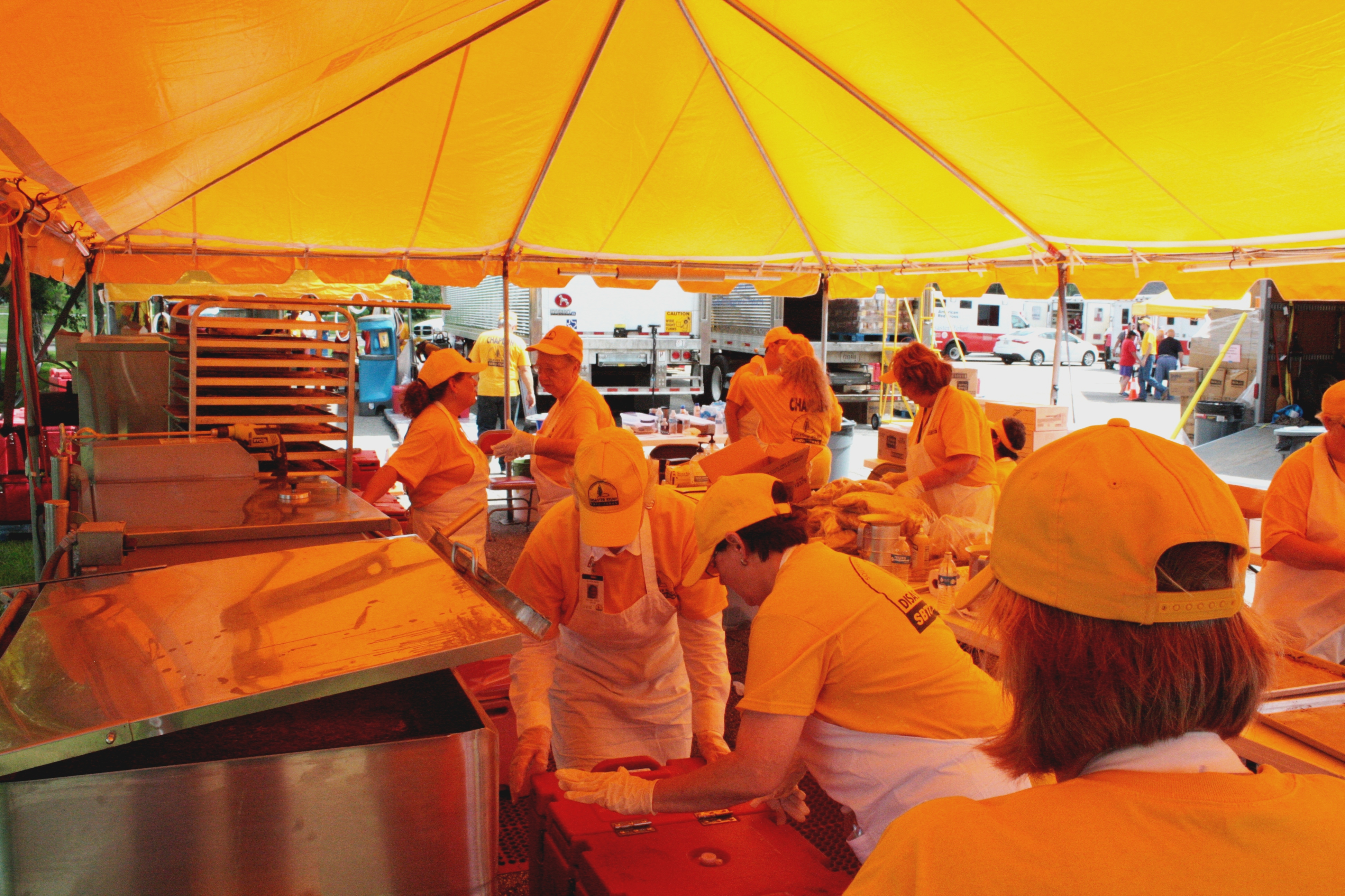 Normalmente, los días empiezan temprano para los que están trabajando en la cocina y no se acaba hasta que las dos comidas sean cocinadas, empaquetas y entregadas  a los vehículos de Red Cross y que toda la cocina este limpia para el siguiente día empezar todo de nuevo.