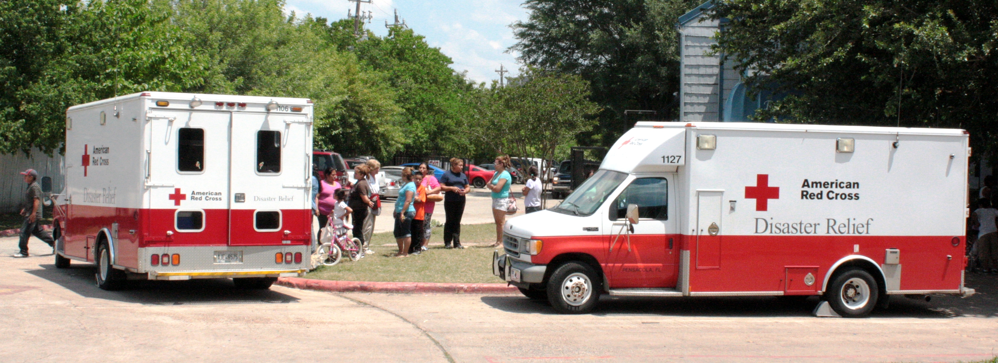 Two Red Cross emergency response vehicles park outside an apartment complex near Houston, Texas after flooding struck the area.The meals are cook by the Southern Baptist Convention Disaster Relief volunteers and delivered by the Red Cross. (Photo by Carl Manning/American Red Cross)