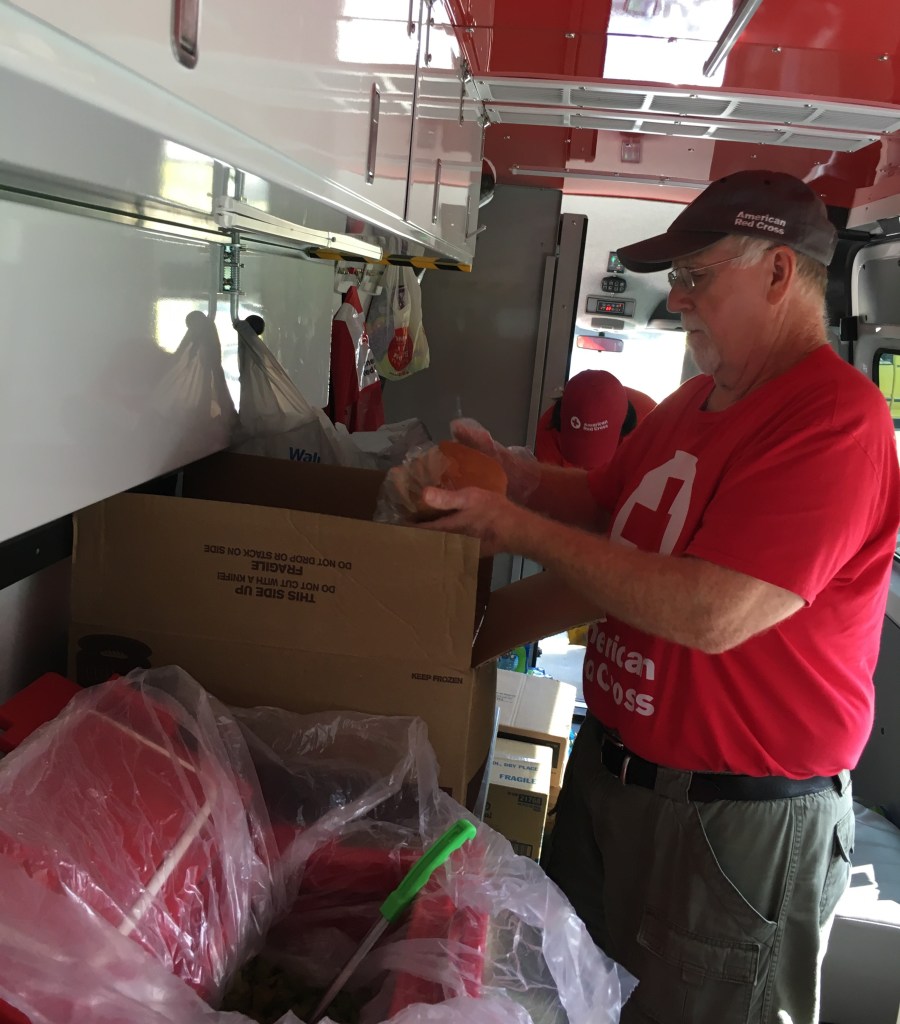 Bill Day from San Antonio is the character of the group, he is a jokester and loves to make you smile. He drives carefully, listens attentively, and patiently maneuvers slowly through the neighborhoods they are serving, making public address announcements about the free lunches, dinners, and snacks available. You can hear him over the PA system in the ERV as he rolls through the streets: “Red Cross is in your neighborhood with free hot meals, snacks, and water. Come up to the truck and we will serve you.”