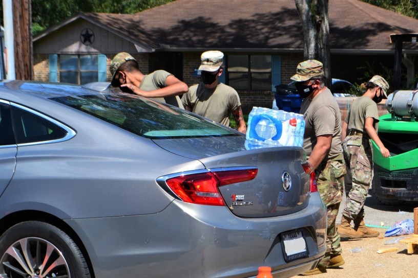 The American Red Cross has a history of supporting and working along side agencies in times of disaster and great need. This time was no exception. To help support the communities impacted by Hurricane Laura, the Red Cross supported several PODS initiated by the state to distribute supplies to impacted residents. One such POD was a distribution site in Kirbyville, Texas with Texas Army National Guard soldiers from the 236 Engineers Company who made the long five and-a-half-hour journey from Stephenville, Texas to assist. They arrived in Kirbyville, Texas early in the afternoon and with the searing Texas sun beating down on them and the heat worsening as time went on, the unit got to work and distributed meals and snacks provided by the Red Cross. The unit also assisted church volunteers with relief efforts at the First Baptist Church by distributing water and ice.