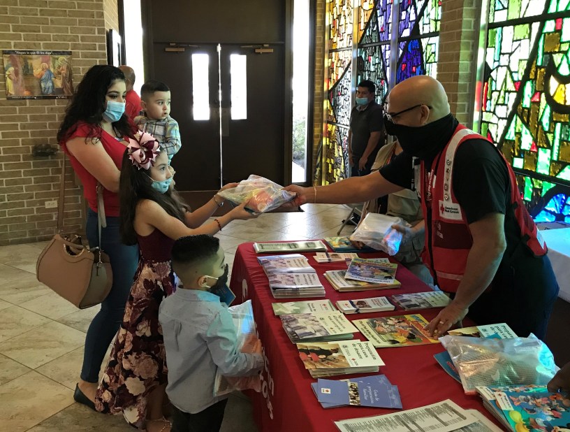 In East Port Arthur, Texas, Saint Joseph Catholic Church is the gathering place for a predominantly Latino populated area. It was the staging site for a unique American Red Cross event organized by the Latino Engagement Team (LET) deployed for Hurricanes Marco, Laura and Delta recovery efforts. Red Crossers handed out 150 activity packets for children and supplied approximately 300 families with cleaning supplies and food.