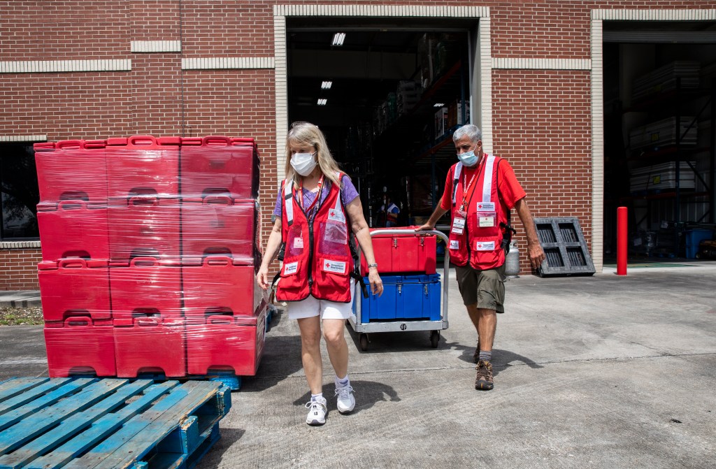 August 28, 2021. Baton Rouge, Louisiana. Red Cross volunteers Joe Apicelli of Groton, CT, and Kathleen Rook of Ashford, CT, load supplies that will be shipped to emergency shelters in preparation for Hurricane Ida. Hurricane Ida is expected to be an extremely dangerous Category 4 storm as it makes landfall along the Gulf Coast on Sunday. By Saturday afternoon, some 450 Red Cross volunteers were on the ground ready to open shelters and support people who need a safe place to stay. Hundreds more volunteers are also being mobilized to support relief efforts after landfall. In addition to pre-positioned supplies, the Red Cross is moving additional truckloads of cots, blankets, comfort kits, and ready-to-eat meals. Photo by Scott Dalton/American Red Cross