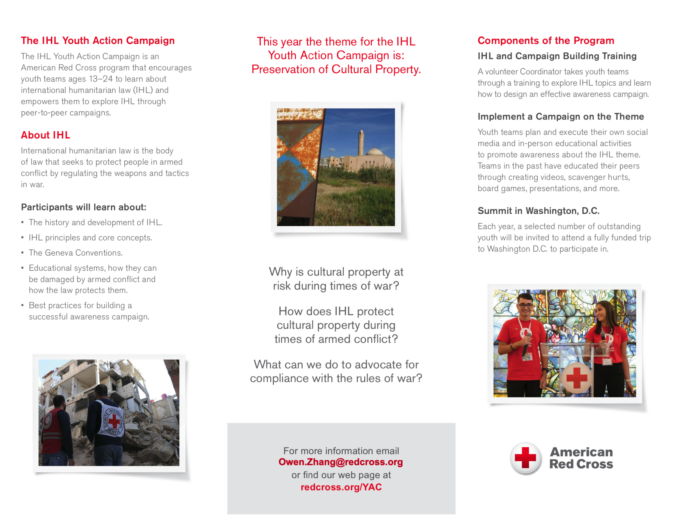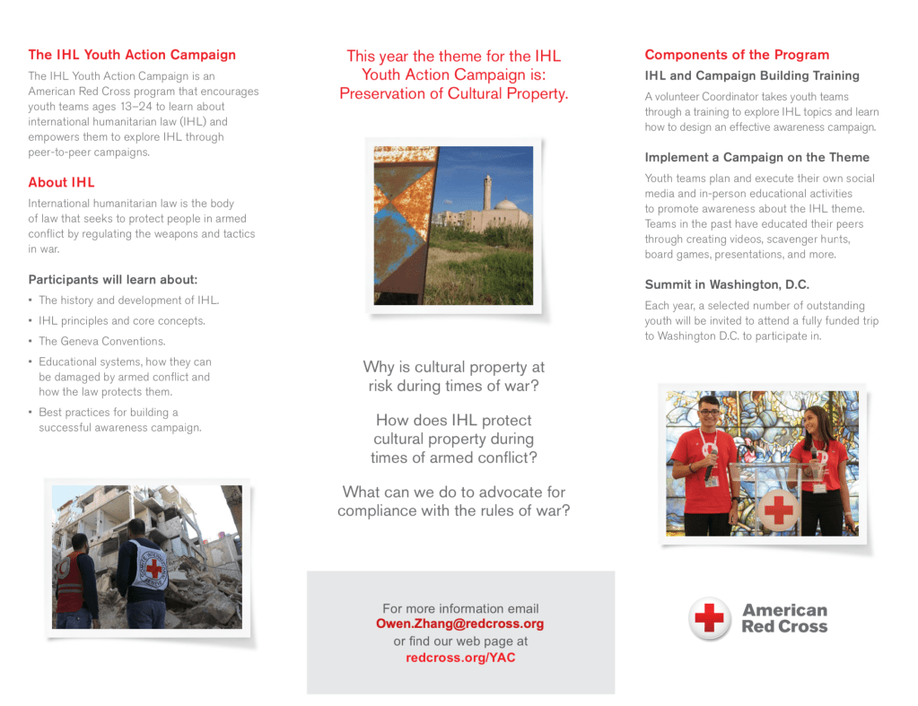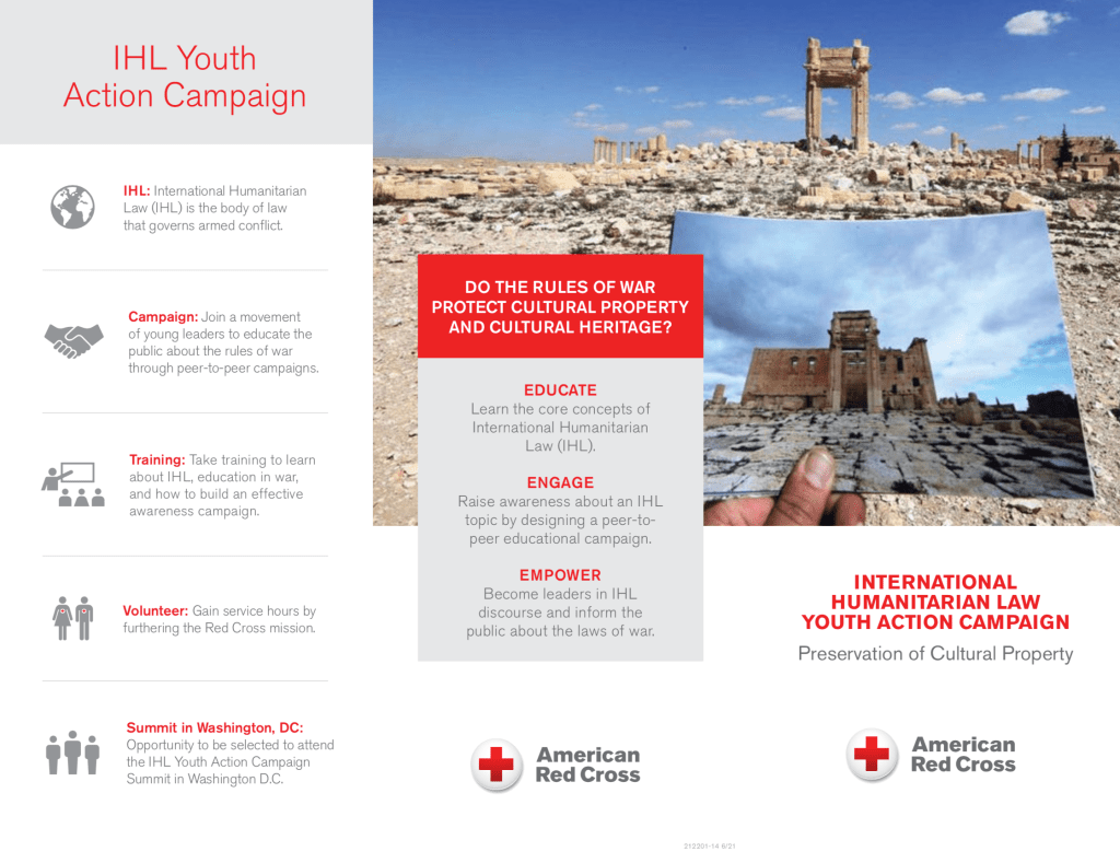 Themes: Each year, the American Red Cross will designate a theme for that year’s competition. For the 2021-2022 competition, the theme is Cultural Preservation in Warfare, including but not limited to: the protection of cultural property during armed conflict, the effects of armed conflict on cultural property, the role of social media in protecting cultural property, cultural property and its effects on cultural heritage, IHL education and its effects on preserving cultural property, or the consequences for those who wrongfully destroy cultural property during armed conflict.