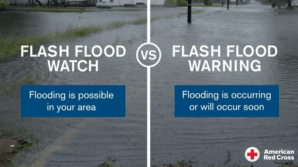 A flood/flash flood WATCH means a flood or flash flood is possible. A flood/flash flood WARNING means flooding, or flash flooding is already occurring or will occur soon. Take immediate precautions.